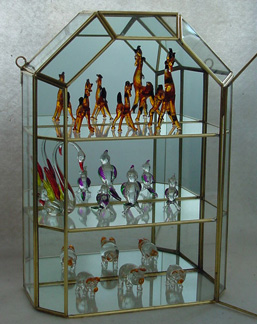 This beautifully designed Brass & Glass cabinet is 12 Inches Tall, 8 1/2 Inches wide, and 3 1/2 Inches Deep Front to Back in the center. This Cathedral style top cabinet can be hung on the wall or it will also look good standing on a Tabletop, Dresser-Top or Shelf. This cabinet includes two brass rings so that it can be hung on most types of walls.