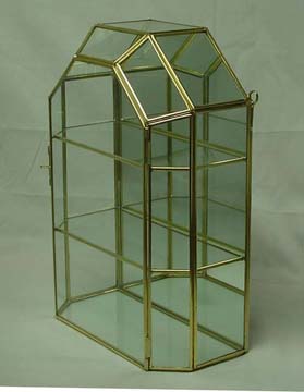 This beautifully designed Brass & Glass cabinet is 12 Inches Tall, 8 1/2 Inches wide, and 3 1/2 Inches Deep Front to Back in the center. This Cathedral style top cabinet can be hung on the wall or it will also look good standing on a Tabletop, Dresser-Top or Shelf. This cabinet includes two brass rings so that it can be hung on most types of walls.