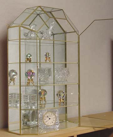 This beautifully designed Brass & Glass cabinet is 24 Inches Tall, 15 Inches wide, and 6 Inches Deep Front to Back in the center. This Cathedral style top cabinet can be hung on the wall or it will also look good standing on a Tabletop, Dresser-Top or Shelf. This cabinet includes two brass rings so that it can be hung on most types of walls.