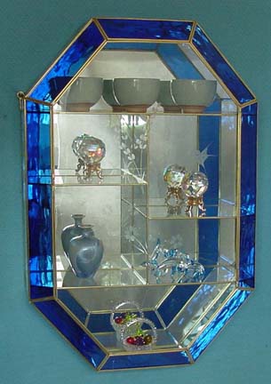 This beautifully designed Brass & Glass cabinet is 24 Inches Tall, 16 1/4 Inches wide, and 5 1/2 Inches Deep Front to Back in the center. This cabinet comes with Dark Blue trim and attractive etchings on the front door of the cabinet. This Medallion Shaped cabinet needs to be hung on a wall for stability and there are two brass hooks attached to the cabinet for that purpose.