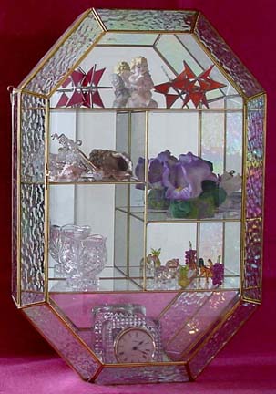 This beautifully designed Brass & Glass cabinet is 24 Inches Tall, 16 1/4 Inches wide, and 5 1/2 Inches Deep Front to Back in the center. This cabinet comes with Pearl effect trim and attractive etchings on the front door of the cabinet. This Medallion Shaped cabinet needs to be hung on a wall for stability and there are two brass hooks attached to the cabinet for that purpose.