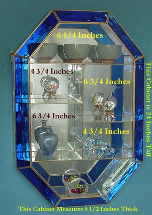 This beautifully designed Brass & Glass cabinet is 24 Inches Tall, 16 1/4 Inches wide, and 5 1/2 Inches Deep Front to Back in the center. This cabinet comes with Pearl effect trim and attractive etchings on the front door of the cabinet. This Medallion Shaped cabinet needs to be hung on a wall for stability and there are two brass hooks attached to the cabinet for that purpose.
