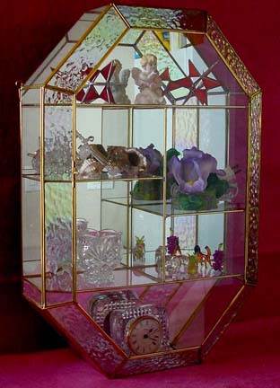 This beautifully designed Brass & Glass cabinet is 24 Inches Tall, 16 1/4 Inches wide, and 5 1/2 Inches Deep Front to Back in the center. This cabinet comes with Pearl effect trim and attractive etchings on the front door of the cabinet. This Medallion Shaped cabinet needs to be hung on a wall for stability and there are two brass hooks attached to the cabinet for that purpose.