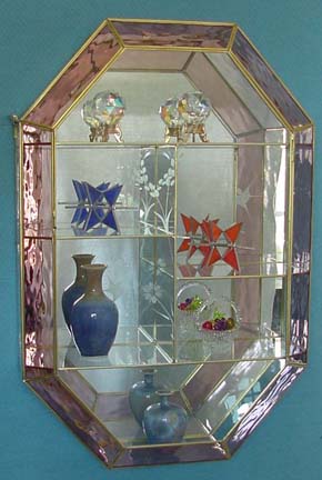 This beautifully designed Brass & Glass cabinet is 24 Inches Tall, 16 1/4 Inches wide, and 5 1/2 Inches Deep Front to Back in the center. This cabinet comes with Rose Red trim and attractive etchings on the front door of the cabinet. This Medallion Shaped cabinet needs to be hung on a wall for stability and there are two brass hooks attached to the cabinet for that purpose.