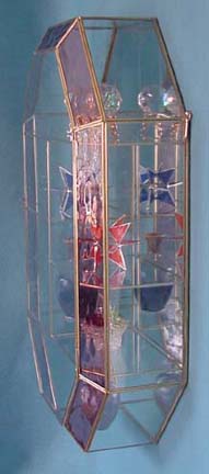 This beautifully designed Brass & Glass cabinet is 24 Inches Tall, 16 1/4 Inches wide, and 5 1/2 Inches Deep Front to Back in the center. This cabinet comes with Rose Red trim and attractive etchings on the front door of the cabinet. This Medallion Shaped cabinet needs to be hung on a wall for stability and there are two brass hooks attached to the cabinet for that purpose.