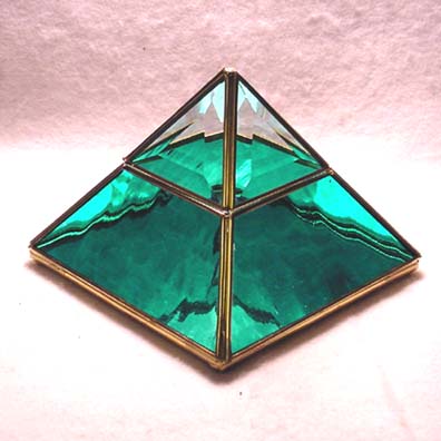 THIS IS ONE BEAUTIFUL NEW PYRAMID BOX WITH A MIRRORED BOTTOM AND A LID. FOUR SMALL ROUND FEET IN THE CORNER MAKE THIS PERFECT FOR COFFEE TABLES AND OTHER GLASS SURFACES. GREAT FOR KEEPING JEWELRY, WATCHES, CASH, CANDY, PRESCRIPTION DRUGS, OR WHATEVER. THIS PYRAMID WAS MADE WITH FROST EFFECT, WATER STAINED GLASS. SEE OUR MAIN PYRAMID MENU IF YOU PREFER ANOTHER COLOR. This pyramid is 6 inches on all sides and it's 4 3/4 inches tall at the center. |