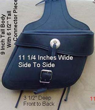 This is our smallest saddlebag. It has a unique countoured or slanted profile that some people feel looks better than a bag that does not have an angled look. Our bag sets all come with an adjustable crossover yoke lays across the bike under the seat, so the set s do not require the use of a mounting bracket. The bag sets have leather straps attached to the backside - that can be tied to a a convenient part of the bike frame or a shock ring. Our craftsmen only use the thickest leather skins to make the bags, since the thin, flappy leather used by most other competitors and imitators may look nice, but it is NOT suitable for longterm use as saddlebag material. We make our bag sets out of leather that can take a pounding from gravel and errant rocks or other road debris without tearing open. Rocks bounce right off the leather we use, instead of leaving a gash. Are bags are handsewn one at a time by craftsmen who know better than to cut corners with cheap threads or other cost-saving gimmicks, that affect how long a bag set will last. Since they are handsewn, they have a rougher look than some of the cookie-cutter bags made of thinner leather, and they have immaterial imperfections that make hand-sewn bags unique. In other words, they don't look like a 'factory' bag you might find at Wallmart or K-Mart. There's some 'pretty' bags out there that will never last nearly as long as ours because they're made out thin leather that should only be use as jacket material. We sell 'pretty' bags made out of thin leather too; they're referred to as purses, and can be found in our purse section@