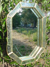 This Exquisite Vanity Tray is made with a Brass Trim and Gorgeous Water Stained Glass. This tray has a hook on the back so it can be used as an attractive wall mirror, or it can also be placed flat on a counter and used as a vanity or jewelry tray. It has small round brass feet for placement on a flat surface