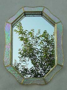 This Exquisite Vanity Tray is made with a Brass Trim and Gorgeous Water Stained Glass. This tray has a hook on the back so it can be used as an attractive wall mirror, or it can also be placed flat on a counter and used as a vanity or jewelry tray. It has small round brass feet for placement on a flat surface