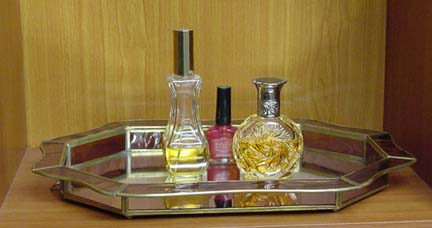 This Exquisite Vanity Tray is made with a Brass Trim and Gorgeous Water Stained Glass. This tray has a hook on the back so it can be used as an attractive wall mirror, or it can also be placed flat on a counter and used as a vanity or jewelry tray. It has small round brass feet for placement on a flat surface