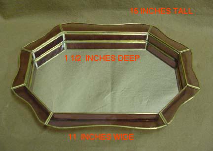 This Exquisite Vanity Tray is made with a Brass Trim and Gorgeous Water Stained Glass. This tray has a hook on the back so it can be used as an attractive wall mirror, or it can also be placed flat on a counter and used as a vanity or jewelry tray. It has small round brass feet for placement on a flat surface