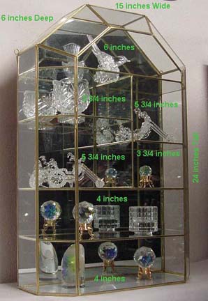 This beautifully designed Brass & Glass cabinet is 24 Inches Tall, 15 Inches wide, and 6 Inches Deep Front to Back in the center. This Cathedral style top cabinet can be hung on the wall or it will also look good standing on a Tabletop, Dresser-Top or Shelf. This cabinet includes two brass rings so that it can be hung on most types of walls.