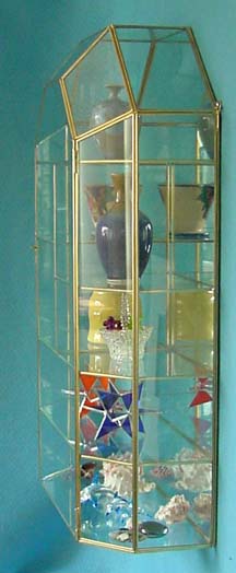 This beautifully designed Brass & Glass cabinet is 24 Inches Tall, 15 Inches wide, and 6 Inches Deep Front to Back in the center. This Cathedral style top cabinet can be hung on the wall or it will also look good standing on a Tabletop, Dresser-Top or Shelf. This cabinet includes two brass rings so that it can be hung on most types of walls.