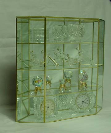 This beautifully designed Brass & Glass cabinet is 14 Inches Tall, 17 wide, and 4 1/2 Inches Deep Front to Back in the center. The space between shelves is approximately 3 1/4 inches. This Flat top style top cabinet can be hung on the wall or it will also look good standing on a Tabletop, Dresser-Top or Shelf. This cabinet includes two brass rings so that it can be hung on most types of walls.