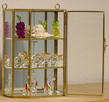 This beautifully designed Brass & Glass cabinet is 7 Inches Tall, 5 3/4 Inches wide, and 2 3/4 Inches Deep Front to Back in the center. This Flat top style cabinet has a mirror backside to reflect your treasures. It can be hung on the wall, or it will also look good standing on a Tabletop, Dresser-Top, or Shelf. This cabinet includes two brass rings so that it can be hung on most types of walls.