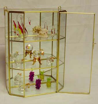 This beautifully designed Brass & Glass cabinet is 12 Inches Tall, 8 1/4Inches wide, and 3 1/2 Inches Deep Front to Back in the center. This Flat top style top cabinet can be hung on the wall or it will also look good standing on a Tabletop, Dresser-Top or Shelf. This cabinet includes two brass rings so that it can be hung on most types of walls.