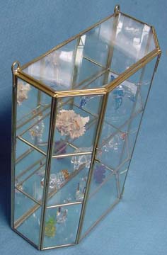 This beautifully designed Brass & Glass cabinet is 12 Inches Tall, 8 1/4Inches wide, and 3 1/2 Inches Deep Front to Back in the center. This Flat top style top cabinet can be hung on the wall or it will also look good standing on a Tabletop, Dresser-Top or Shelf. This cabinet includes two brass rings so that it can be hung on most types of walls.