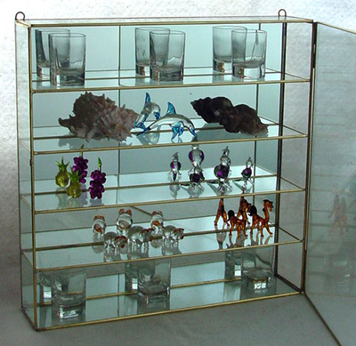 This beautifully designed Brass & Glass cabinet is 15 Inches Tall, 15 Inches wide, and 2 3/4 Inches Deep Front to Back in the center. This Flat top style cabinet has a mirror backside to reflect your treasures. Thiscabinet is designed to be hung on the wall, but it can be used on a tabletop too. This cabinet includes two brass rings so that it can be hung on most types of walls.