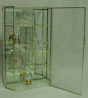 This beautifully designed Brass & Glass cabinet is 17 Inches Tall, 10 3/4Inches wide, and 5 Inches Deep Front to Back in the center. This Flat top style top cabinet can be hung on the wall or it will also look good standing on a Tabletop, Dresser-Top or Shelf. This cabinet includes two brass rings so that it can be hung on most types of walls.