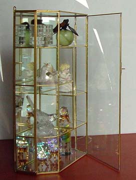 This beautifully designed Brass & Glass cabinet is 17 Inches Tall, 10 3/4Inches wide, and 5 Inches Deep Front to Back in the center. This Flat top style top cabinet can be hung on the wall or it will also look good standing on a Tabletop, Dresser-Top or Shelf. This cabinet includes two brass rings so that it can be hung on most types of walls.