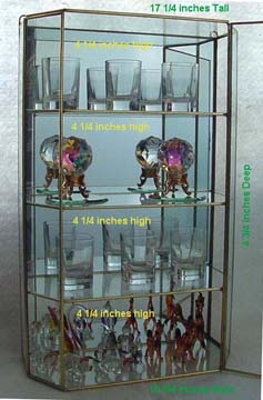 This beautifully designed Brass & Glass cabinet is 17 Inches Tall, 10 3/4Inches wide, and 5 Inches Deep Front to Back in the center. This Flat top style top cabinet can be hung on the wall or it will also look good standing on a Tabletop, Dresser-Top or Shelf. This cabinet includes two brass rings so that it can be hung on most types of walls.