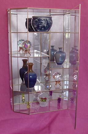 This beautifully designed Brass & Glass cabinet is 20 Inches Tall, 14 Inches wide, and 5 1/2 Inches Deep Front to Back in the center. This Flat top style top cabinet can be hung on the wall or it will also look good standing on a Tabletop, Dresser-Top or Shelf. This cabinet includes two brass rings so that it can be hung on most types of walls.