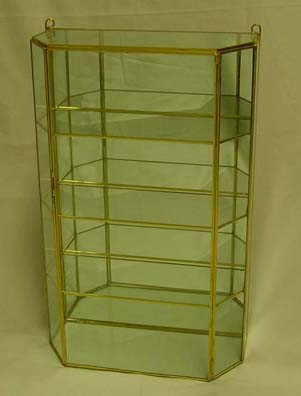 This beautifully designed Brass & Glass cabinet is 20 Inches Tall, 14 Inches wide, and 5 1/2 Inches Deep Front to Back in the center. This Flat top style top cabinet can be hung on the wall or it will also look good standing on a Tabletop, Dresser-Top or Shelf. This cabinet includes two brass rings so that it can be hung on most types of walls.