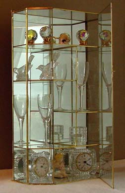 This beautifully designed Brass & Glass cabinet is 23 3/4 Inches Tall, 14 1/2 Inches wide, and 6 Inches Deep Front to Back in the center. This Flat top style top cabinet can be hung on the wall or it will also look good standing on a Tabletop, Dresser-Top or Shelf. This cabinet includes two brass rings so that it can be hung on most types of walls.