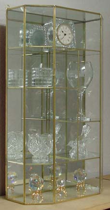 This beautifully designed Brass & Glass cabinet is 23 3/4 Inches Tall, 14 1/2 Inches wide, and 6 Inches Deep Front to Back in the center. This Flat top style top cabinet can be hung on the wall or it will also look good standing on a Tabletop, Dresser-Top or Shelf. This cabinet includes two brass rings so that it can be hung on most types of walls.