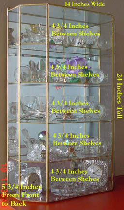 This beautifully designed Brass & Glass cabinet is 23 3/4 Inches Tall, 14 1/2 Inches wide, and 6 Inches Deep Front to Back in the center. This Flat top style top cabinet can be hung on the wall or it will also look good standing on a Tabletop, Dresser-Top or Shelf. This cabinet includes two brass rings so that it can be hung on most types of walls.