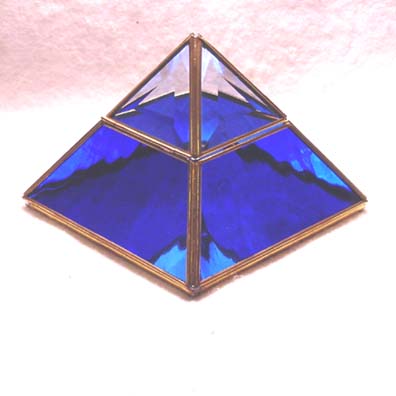 THIS IS ONE BEAUTIFUL NEW PYRAMID BOX WITH A MIRRORED BOTTOM AND A LID. FOUR SMALL ROUND FEET IN THE CORNER MAKE THIS PERFECT FOR COFFEE TABLES AND OTHER GLASS SURFACES. GREAT FOR KEEPING JEWELRY, WATCHES, CASH, CANDY, PRESCRIPTION DRUGS, OR WHATEVER. THIS PYRAMID WAS MADE WITH DARK BLUE, WATER STAINED GLASS. SEE OUR MAIN PYRAMID MENU IF YOU PREFER ANOTHER COLOR. This pyramid is 6 inches on all sides and it's 4 3/4 inches tall at the center. |