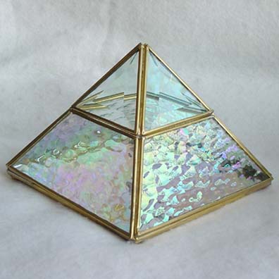 THIS IS ONE BEAUTIFUL NEW PYRAMID BOX WITH A MIRRORED BOTTOM AND A LID. FOUR SMALL ROUND FEET IN THE CORNER MAKE THIS PERFECT FOR COFFEE TABLES AND OTHER GLASS SURFACES. GREAT FOR KEEPING JEWELRY, WATCHES, CASH, CANDY, PRESCRIPTION DRUGS, OR WHATEVER. THIS PYRAMID WAS MADE WITH PEARL EFFECT, WATER STAINED GLASS. SEE OUR MAIN PYRAMID MENU IF YOU PREFER ANOTHER COLOR. This pyramid is 6 inches on all sides and it's 4 3/4 inches tall at the center. |